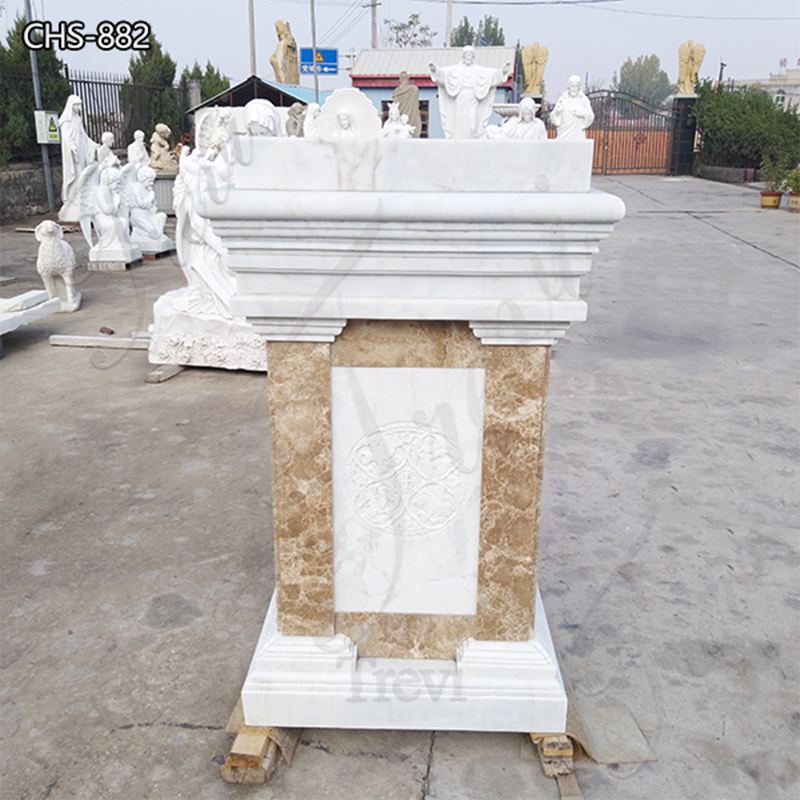 The material that is used to carve this pulpit is natural marble. Pure natural marble has extremely high hardness and density. The pulpit made with it could be used in the church for many years. In addition, some natural marbles come with beautiful veins. These natural veins on the surface are gifts from nature and could be very decorative for sculpture. So, it would be more appropriate to use natural marble for these Catholic church furniture.