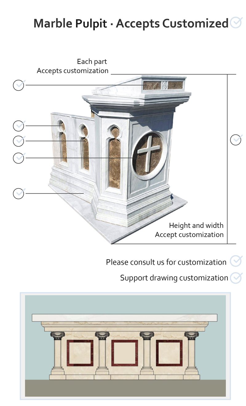 Trevi’s offers customization services to church pulpit designs. To make customers have a good user experience, To further personalize your experience, we can also accommodate specific customization requests. Whether it’s adjusting dimensions, incorporating additional ornamental elements, or complying with specific design preferences, our skilled artisans strive to bring your vision to life.