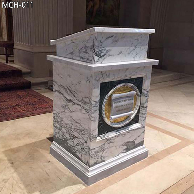 Carved from the finest Carrara marble, This marble pulpit is a testament to timeless elegance and superior design. The Carrara marble, renowned for its pristine whiteness and subtle veining, lends an air of sophistication and grace to the pulpit, making it not just a functional piece but a work of art that enhances the sanctity and aesthetic appeal of any church interior.