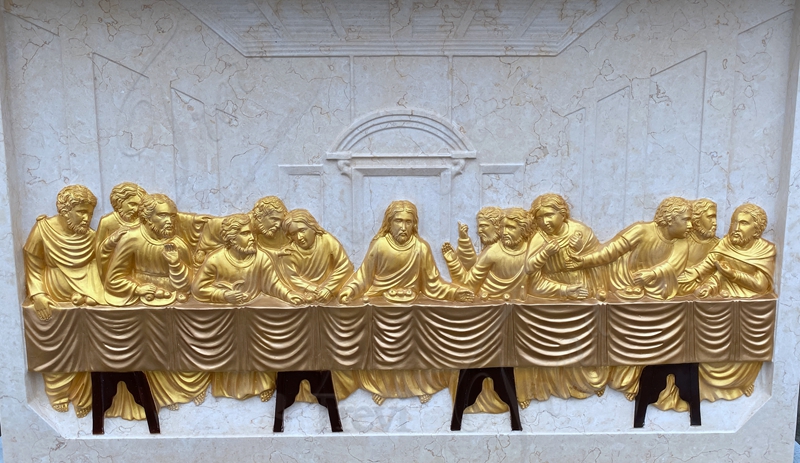This catholic marble altar is custom-made for one of our clients. According to his request, we carved Leonardo da Vinci’s masterpiece, The Last Supper, in front of the altar, and chose gray and white in line with the overall color. The columns on both sides are decorated with beige. The whole is harmonious and perfect. Customers could be satisfied with this. Also, we have carved The Last Supper in gold for other clients before. These are two different styles. But all have satisfactory results.