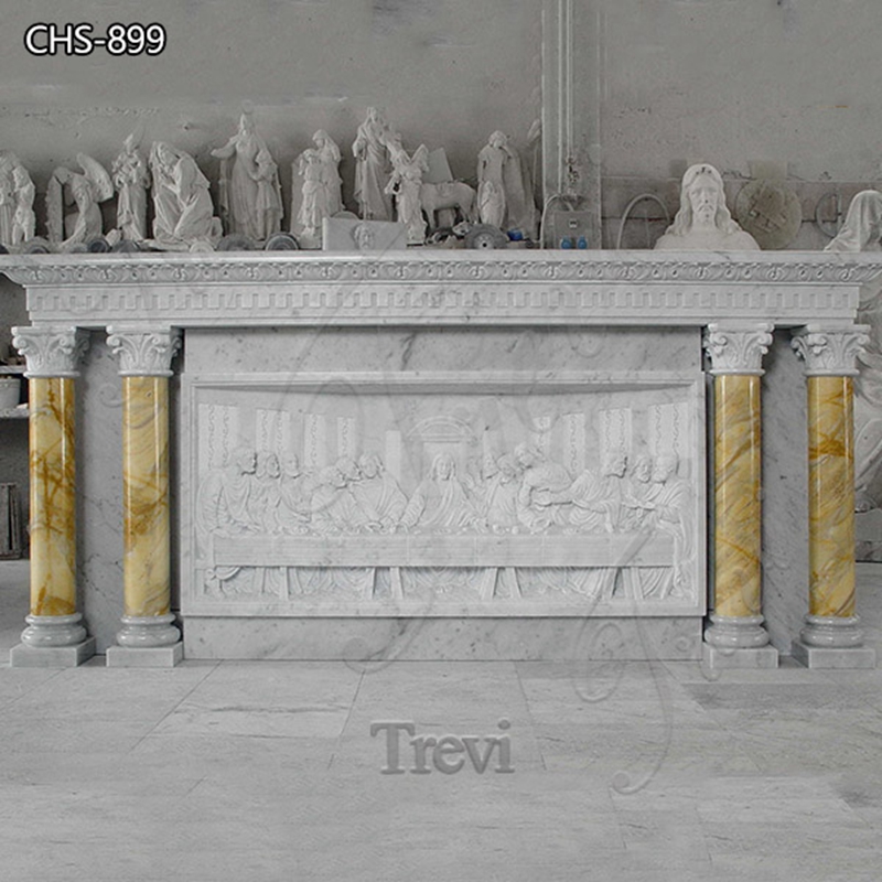 Most of the customers who buy a Catholic marble altar place great importance on its quality. And our large altar with The Last Supper is made of purely natural marble. The artists who sculpted it are Catholic believers we hired exclusively. And they also have a lot of research on famous works, so they are handy when carving. The characteristics of each of these 13 people are vividly displayed. Coupled with the beige columns on both sides of the altar, it is no longer visually monotonous. The clever use of color and the ingenious design combine to make this perfect altarpiece.