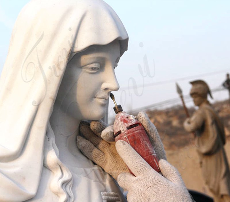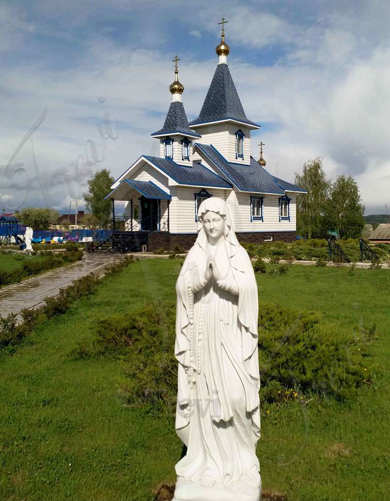 This white marble outdoor Our Lady of Lourdes statue is deeply carved. Trevi artists have high carving skills. They have been engaged in figure sculpture for over ten years. As a result, the Virgin’s gentle face and smooth and delicate skin could be sculpted to life. Of course, our artists also sculpted the gracious facial expressions of the Virgin Mary very realistically. You could clearly see that the beading of the Virgin is also beautiful. There is no doubt that these details were perfectly rendered by our excellent carvers.