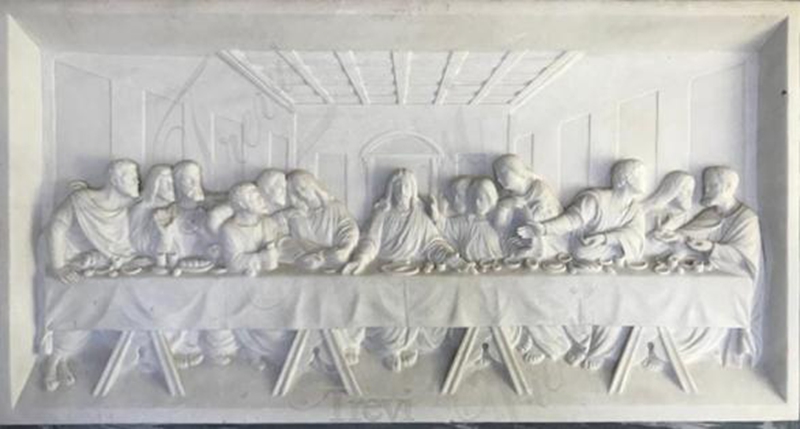 This marble religious altar is all white and has a relatively large size. It is made of high-quality marble and is finely carved. There are some grey lines on the columns on both sides, adding an artistic element to the altar. In front of it is Leonardo da Vinci’s work The Last Supper, which is meticulously sculpted by Trevi sculptors. Each character has rich expressions and different gestures, perfectly showing the original style of the famous artist.