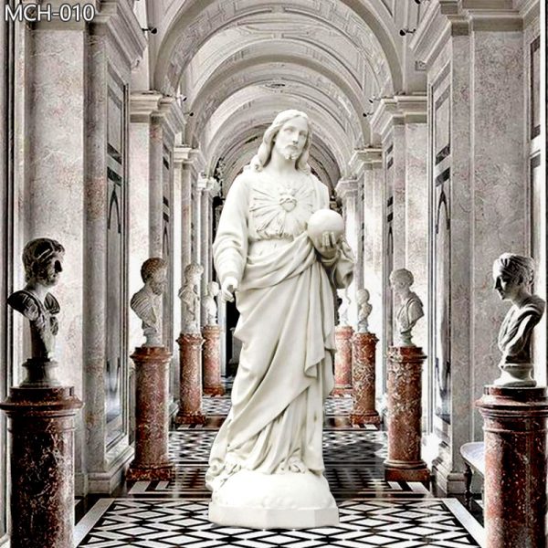 This is a sacred heart Jesus statue. It is carved in Grade-A white marble. The statue is a very exquisite and classic religious statue.
