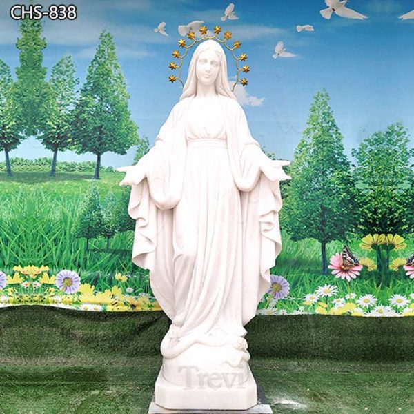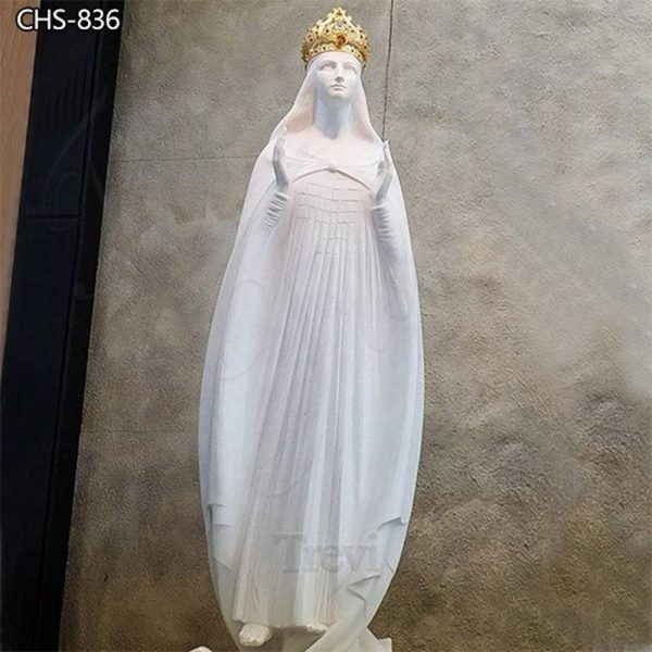 The Trevi white marble Our Lady of Peace statue would completely catch your eye. Our image of the Virgin radiates divine light. In particular, the head of the Virgin wears a golden five-star crown. If you want to know more about this Virgin, please contact Trevi today. We would provide you with more engraving details and a process flow chart.