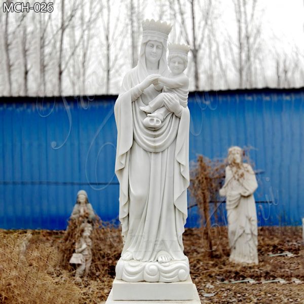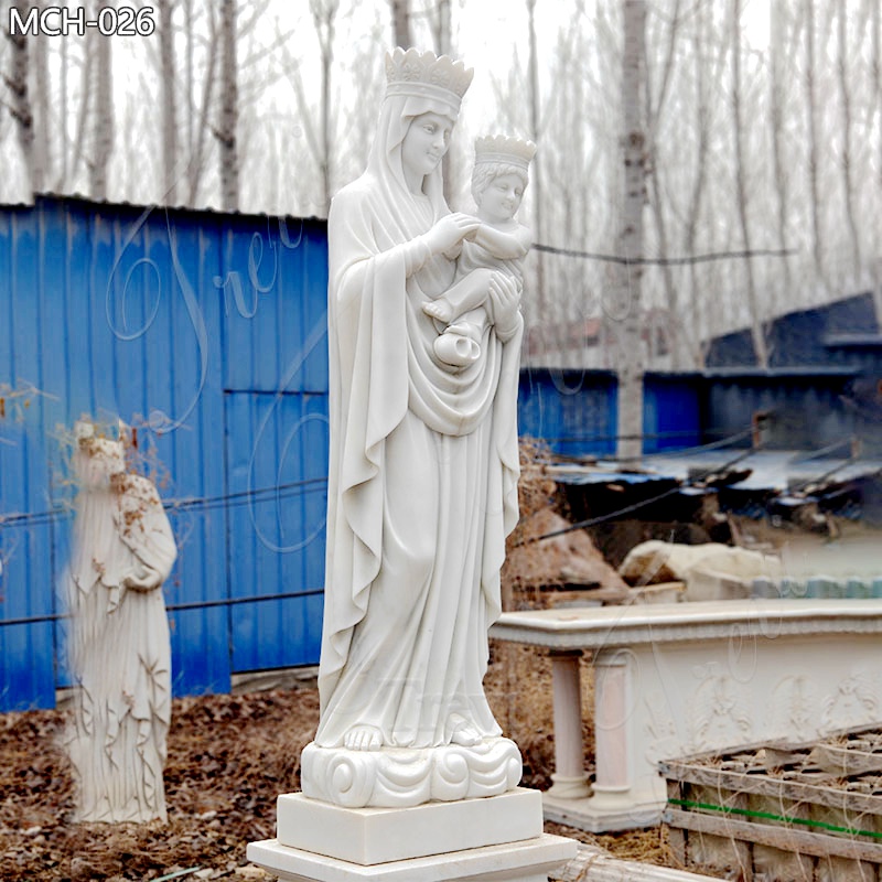 This exquisite marble Mary Holding Jesus Sculpture depicts the Virgin Mary cradling the infant Jesus. Crafted from pristine white marble, the sculpture emanates an aura of elegance and holiness. Both the Virgin Mary and Baby Jesus are adorned with crowns, symbolizing their regality.