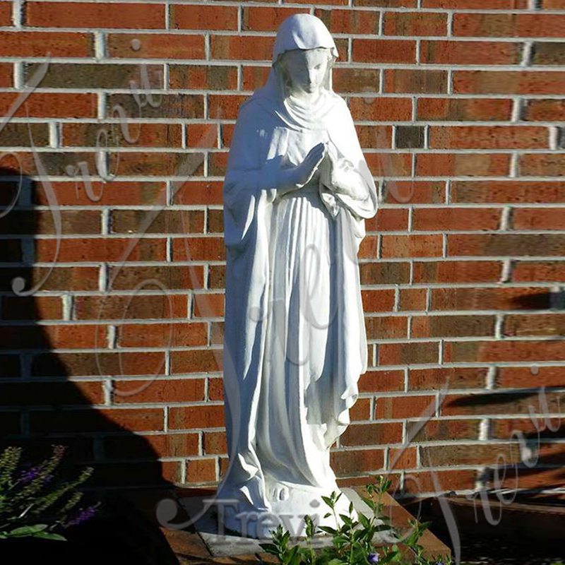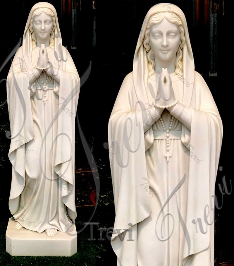 This is a life-size sculpture of the catholic Virgin Mary, all carved out of purely natural marble. The white marble and the delicate virgin Mary statue completely show the purity and holiness of the Virgin. The white sculpture of the Virgin Mary is praying with her eyes closed and her hands folded in front of her chest. Her face is very kind and gentle, and people will calm down when facing such a sculpture.