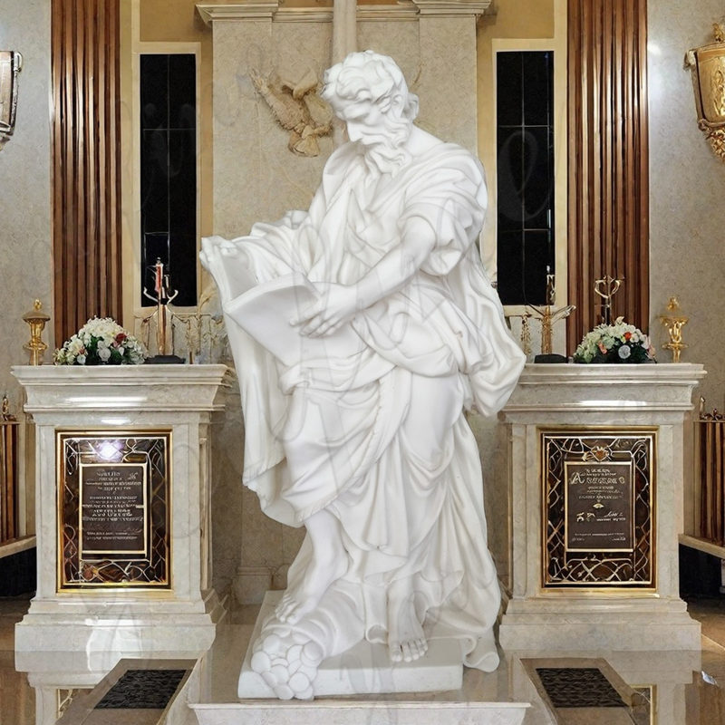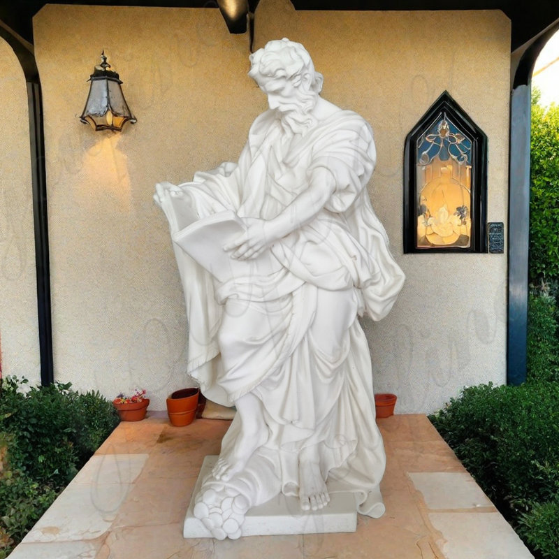 This white marble religious statue is of the holy Saint Matthew statue. This statue presents him wearing a robe with thick hair and a beard. And there is a book in his hand and a money bag under one of his feet. The book he holds in his hand is the Gospel of Matthew, and the money bag under his feet represents his former identity as a tax collector.