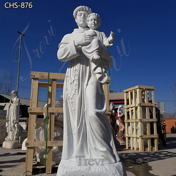 This is a life-size Saint Anthony garden statue. Young Anthony held the baby Jesus, and he looks so gentle. We could see Anthony’s clearly visible facial expression. His curly hair was so natural, and his neat and tidy clothes enhanced his image. The overall pure white color makes it tall, and the pure image is perfectly displayed. We made this sculpture out of natural marble, giving it a long service life. The exquisite carvings of the master carvers make St. Anthony extremely realistic.